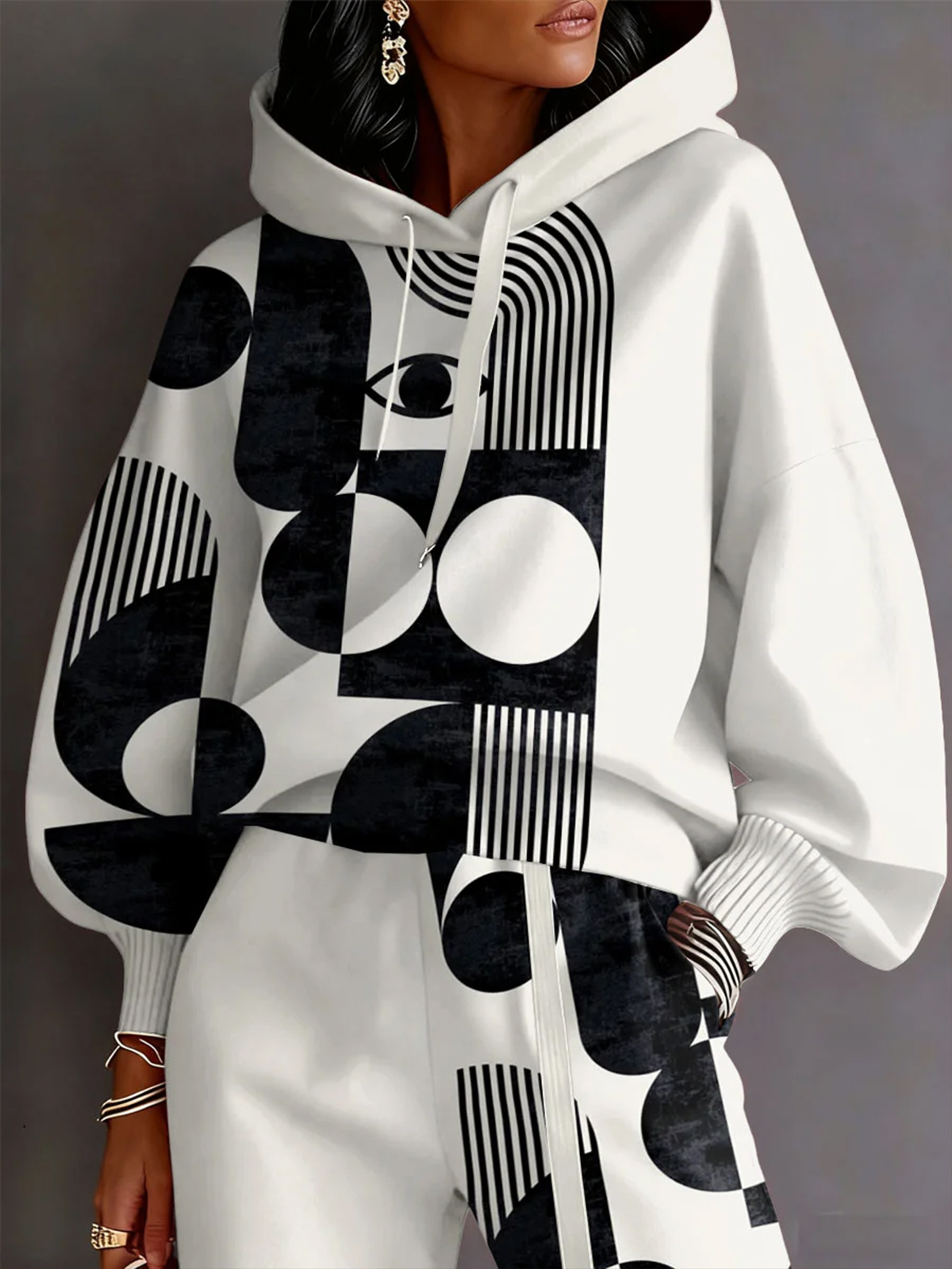 Women's Abstract Geometric Line Art Black Faces Print Hoodie