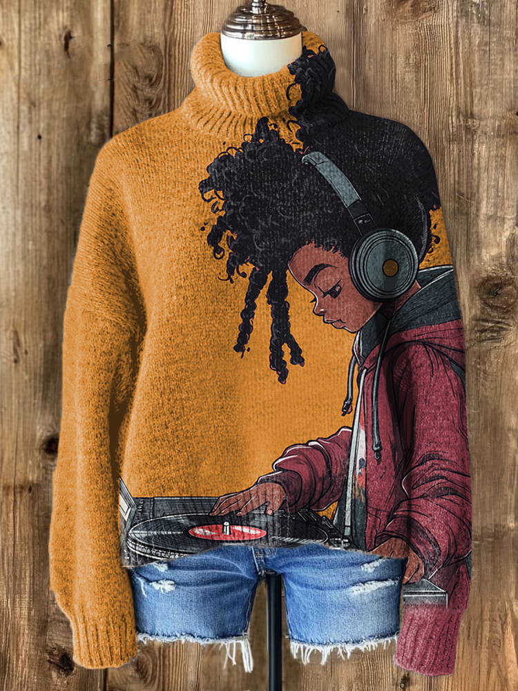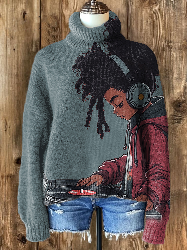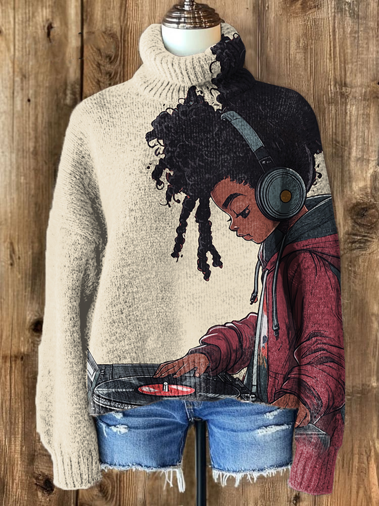 Women's Afro Kid Music Lover Print High Neck Knit Sweatshirt